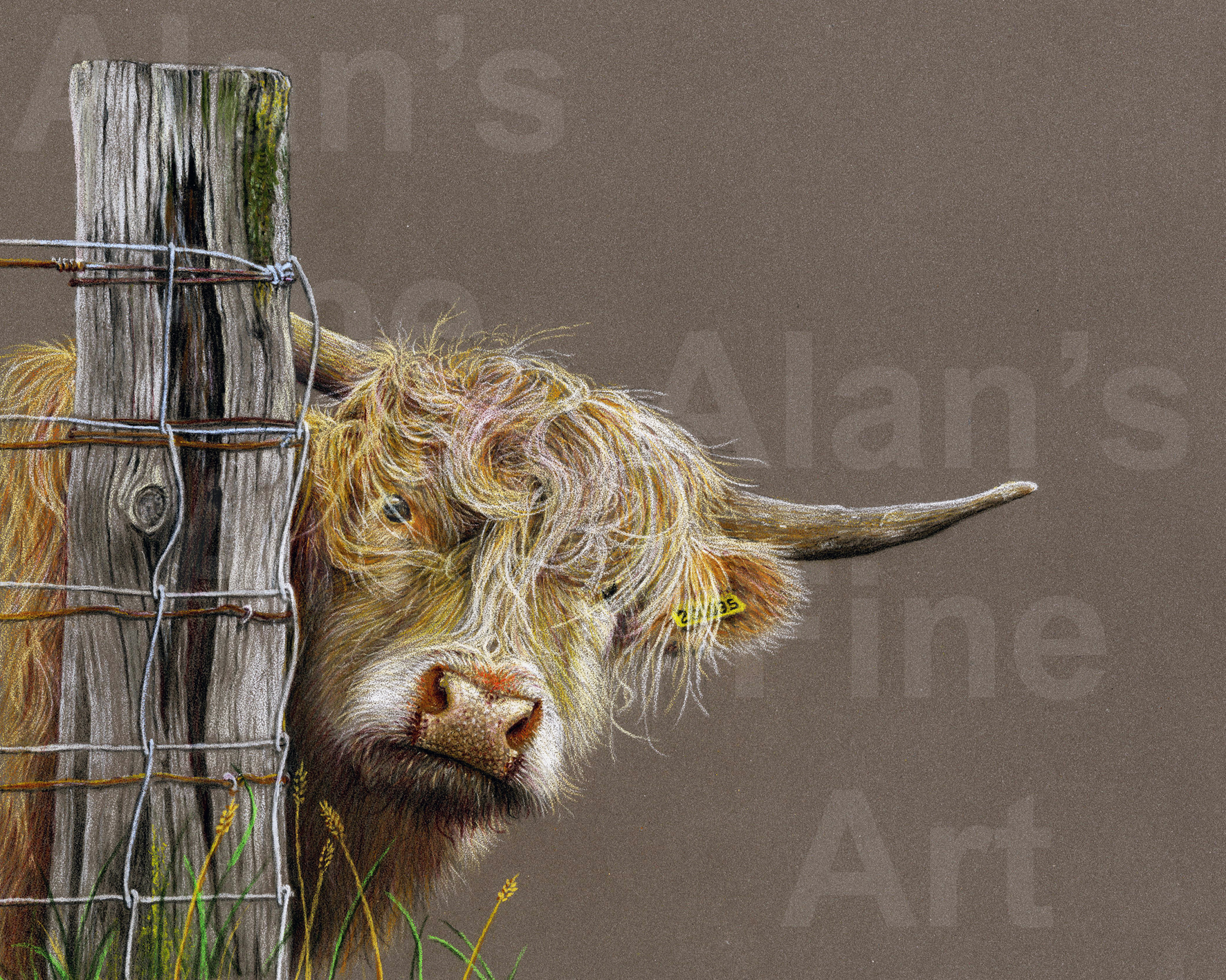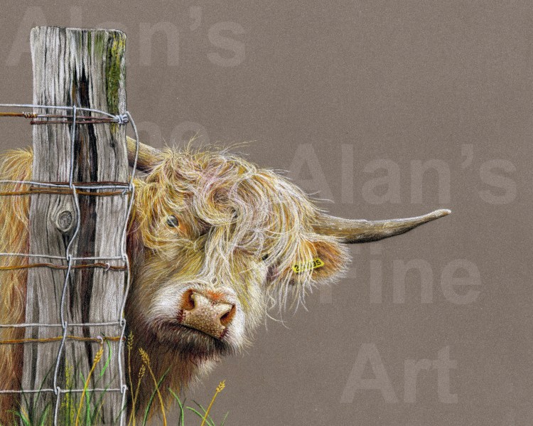 Having had a great desire to draw a Highland Cow for a long time now, I have finally got round to it and I must say I feel it has proved worth waiting for as I am very pleased with the result. I hope you feel the same way about it as I’m offering limited edition prints on high quality bamboo card of this special original artwork (320mm x 240mm) and ready for framing. I will also include a greetings card with every one purchased. See below for details and how to get one.