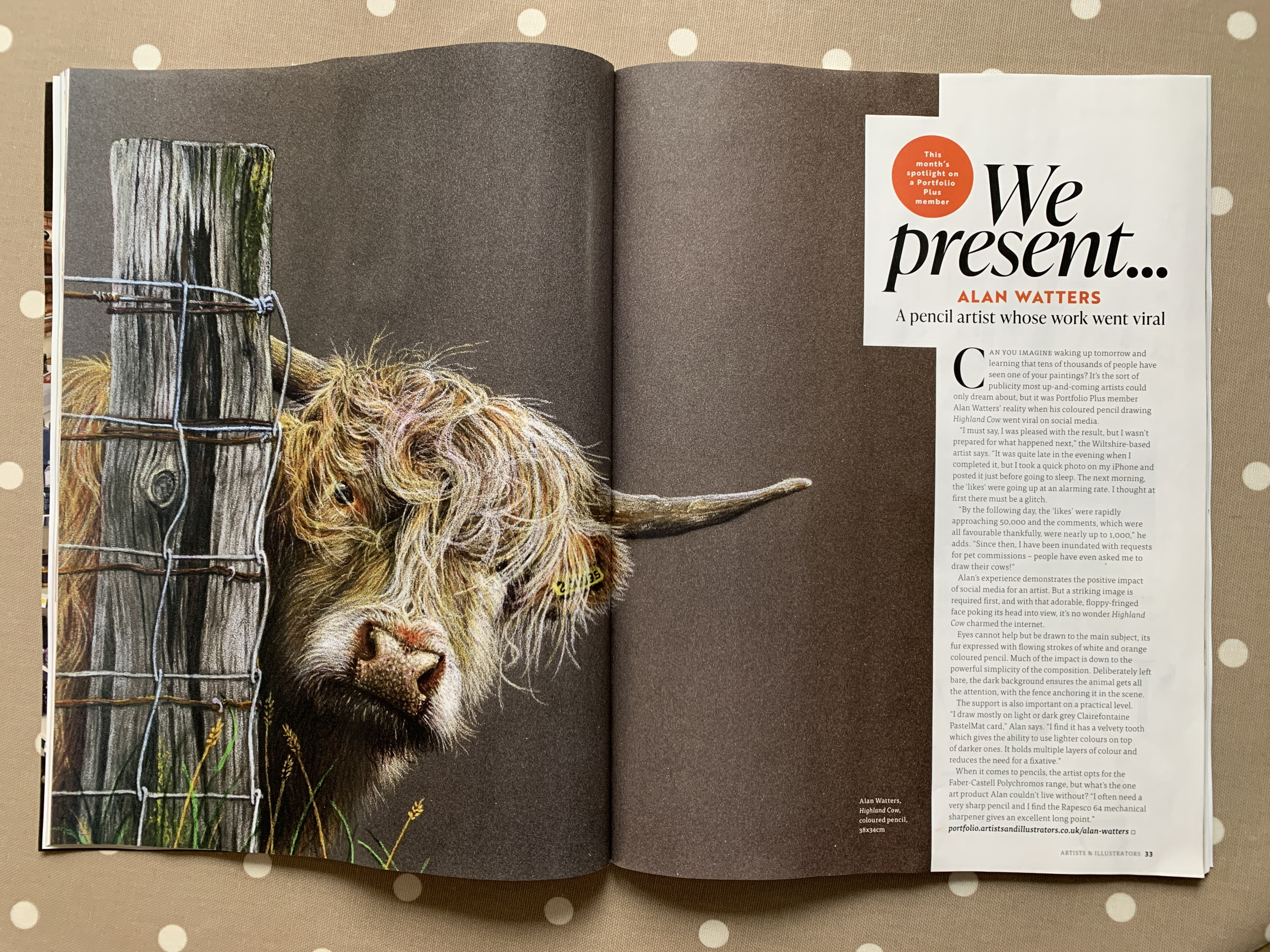 MORE NEWS – I have been published!! My highland cow drawing was featured in the July 2022 issue of Artists and Illustrators magazine. Moooooooove over Manet ha ha!