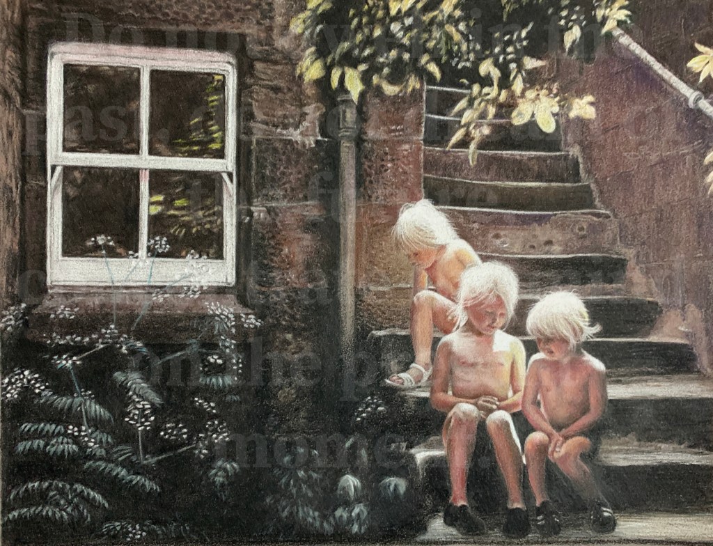 I was delighted that one of two drawings that I submitted to the UK Colour Pencil Society Annual Exhibition 2024 was selected for exhibition. It was ‘My little rays of sunshine’ which I drew from a photograph that I took of my children (then 2, 4 and 6 years old) 42 years ago with my old Zenit E camera. Please ignore the watermark as it is not on the original drawing.